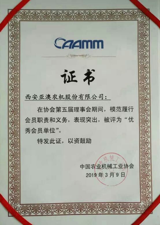 大會宣讀了中國機械工業(yè)聯(lián)合會《關(guān)于中國農(nóng)業(yè)機械工業(yè)協(xié)會理事會換屆的批復(fù)》。審議通過了陳志會長代表協(xié)會第五屆理事會作的《中國農(nóng)機工業(yè)協(xié)會第五屆理事會工作報告》和侯慶忠執(zhí)行副會長作的《中國農(nóng)機工業(yè)協(xié)會第五屆理事會財務(wù)收支情況報告》,審議通過了《中國農(nóng)業(yè)機械工業(yè)協(xié)會章程》,選舉產(chǎn)生了中國農(nóng)業(yè)機械工業(yè)協(xié)會第六屆理事會和第一屆監(jiān)事會。 為表彰協(xié)會五屆理事會履職以來,為推進農(nóng)機工業(yè)技術(shù)進步和健康發(fā)展做出積極貢獻的優(yōu)秀集體和個人,會議還授予侯慶忠等10人為“優(yōu)秀協(xié)會工作者”,授予企業(yè)管理委員會等5個分支機構(gòu)為“先進分支機構(gòu)”,授予西安亞澳農(nóng)機股份有限公司等33家單位為“優(yōu)秀會員單位”。 亞澳農(nóng)機總經(jīng)理史森強應(yīng)邀參會并參加相關(guān)活動。榮獲“優(yōu)秀會員單位”是協(xié)會對亞澳多年來投身農(nóng)機事業(yè)的充分肯定和高度認可,亞澳也將以此為契機,不忘初心、篤定前行,為促進我國農(nóng)機產(chǎn)業(yè)轉(zhuǎn)型升級,推動我國農(nóng)業(yè)全程全面機械化做出新的更大貢獻。
