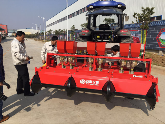 唐河縣土地面積250多萬畝,花生種植面積60多萬畝。為了推進唐河花生種植面積能夠進一步擴大,縣政府指示依托縣農(nóng)機產(chǎn)業(yè)園亞澳農(nóng)機生產(chǎn)、研發(fā)專門用于花生種植、收獲的機械。亞澳今天投放市場的花生精量播工作效率相當于60人的工作量,已成為春耕的主力軍。在上屯鎮(zhèn)演示會現(xiàn)場,隆隆的機聲中,四臺不同規(guī)格的花生精量施肥播種機同時作業(yè)。所到之處,能夠一次性完成播種、施肥、起壟等多道工序,實現(xiàn)了多壟多行寬幅聯(lián)合播種作業(yè)。