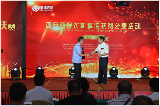 開(kāi)機(jī)儀式上,中國(guó)農(nóng)機(jī)化協(xié)會(huì)還就“甘肅省蘭州市永登縣”精準(zhǔn)扶貧工作給予亞澳高度的認(rèn)可。永登縣團(tuán)莊村屬干旱貧困山區(qū),全村現(xiàn)有7個(gè)村民小組,421戶(hù)、1696人。近年來(lái),幫扶單位先后捐贈(zèng)了30多臺(tái)(套)特色農(nóng)機(jī)具,但仍缺少大中型農(nóng)機(jī)具,農(nóng)機(jī)化服務(wù)能力不足,不能滿足農(nóng)業(yè)生產(chǎn)需求。此次中國(guó)農(nóng)業(yè)機(jī)械化協(xié)會(huì)聯(lián)合亞澳公司等有關(guān)單位向團(tuán)莊村捐贈(zèng)價(jià)值40多萬(wàn)元農(nóng)業(yè)機(jī)械,必將對(duì)團(tuán)莊和周邊鄉(xiāng)村農(nóng)業(yè)和農(nóng)村經(jīng)濟(jì)發(fā)展、全面建設(shè)小康社會(huì)起到很大地推進(jìn)作用。