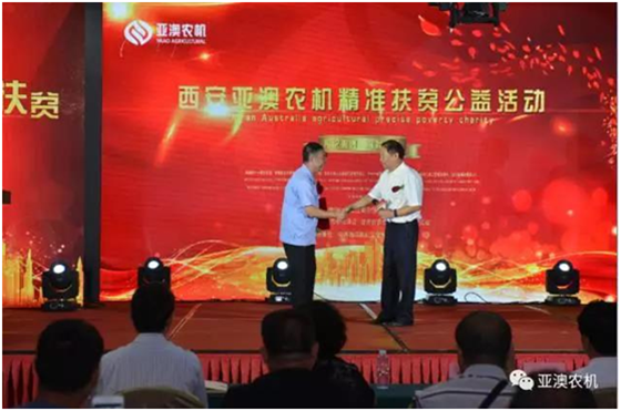 亞澳精準(zhǔn)扶貧公益活動(dòng)現(xiàn)場,中國農(nóng)機(jī)化協(xié)會(huì)會(huì)長劉憲到會(huì)致辭,并給予亞澳頒發(fā)證書。