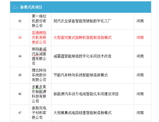 近日,亞澳農機被國家工信部評為2017年智能制造綜合標準化與新模式應用示范企業(yè)。據了解,這次全國智能制造綜合標準化專項項目批準企業(yè)43 家,河南省內2家,為機械工業(yè)第六設計研究院,洛陽軸研科技股份有限公司國有大型企業(yè);新模式應用立項51家,河南省僅批準6家,亞澳智能化制造新模式成為業(yè)界首家,并獲得國家專項資金補貼。